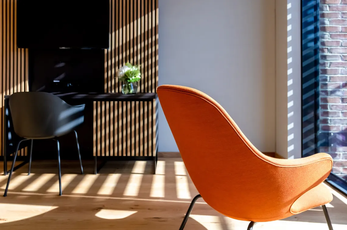 The approx. 29 m², bright and elegant rooms with wooden floorboards and a view of the tranquil courtyard are equipped with a desk, a flat-screen TV, and a comfortable 1.80 m wide box spring bed. They are attached to a luxurious travertine bathroom with rain shower and separate toilet. The first-floor rooms come with patio doors leading into the courtyard, while those on the 1st floor come with a French balcony.